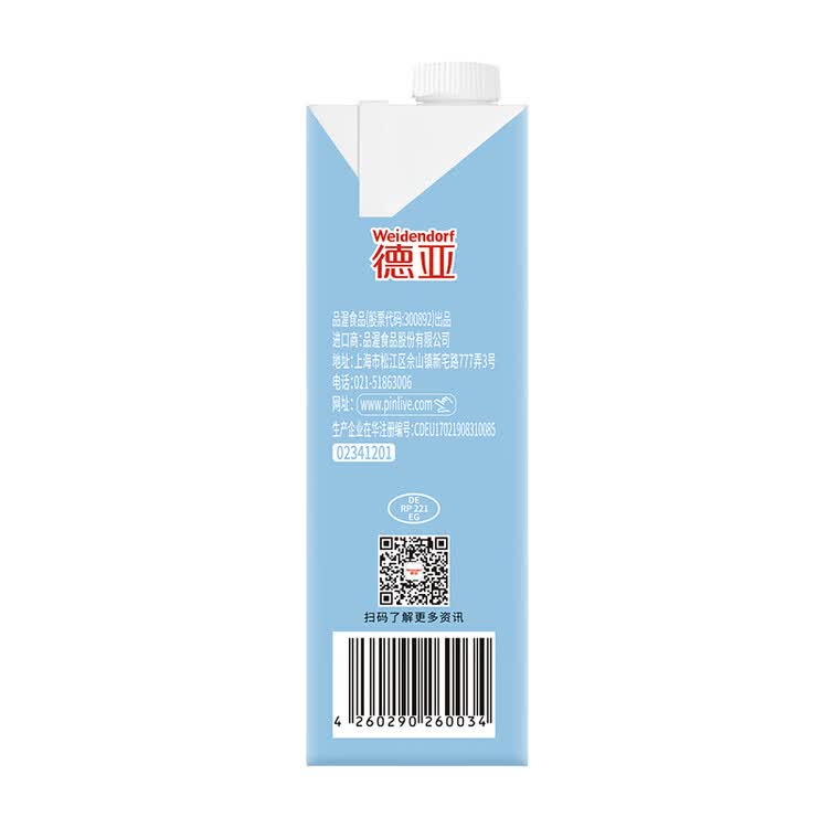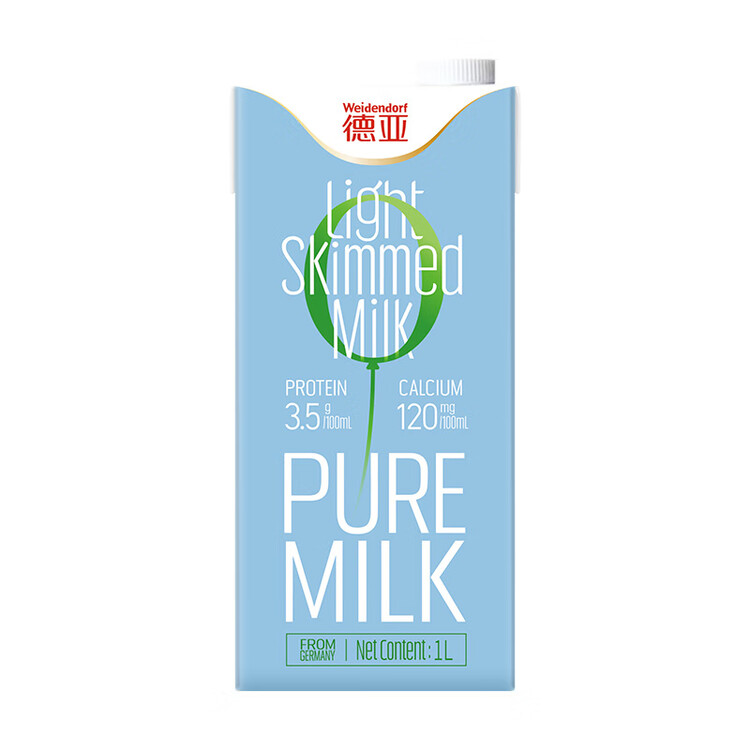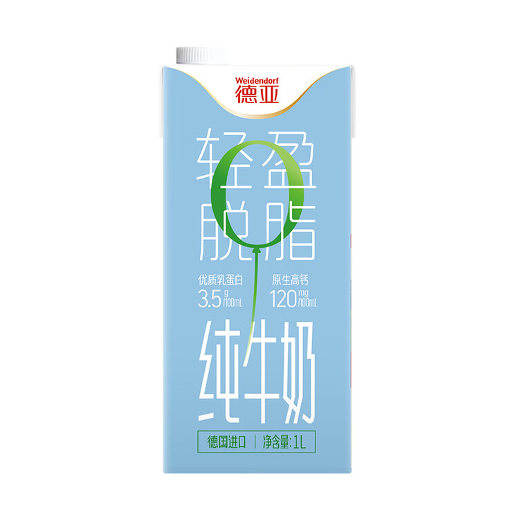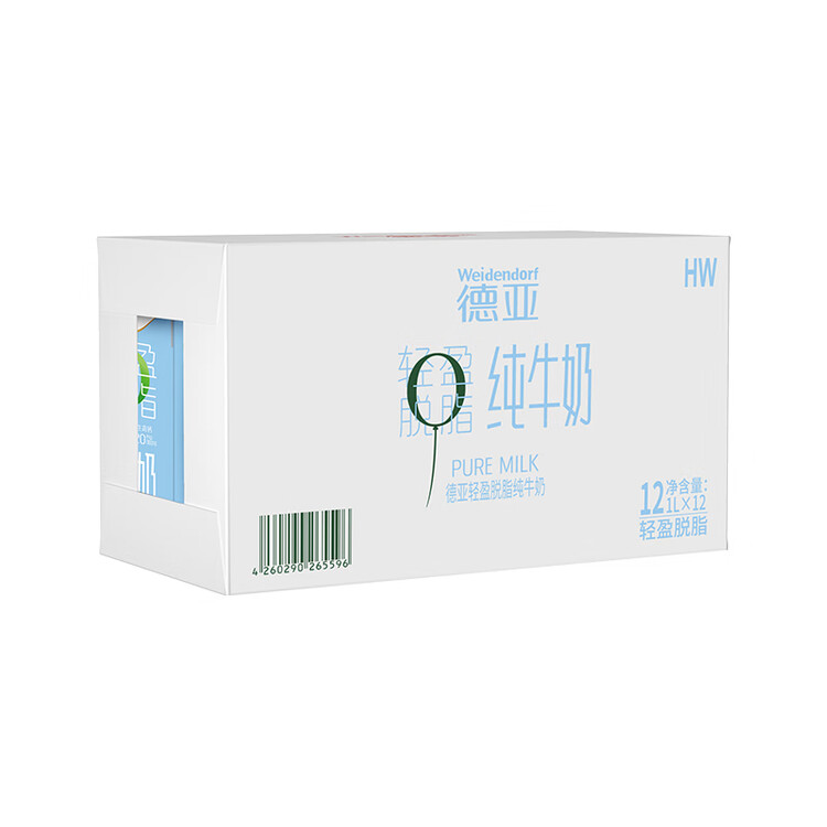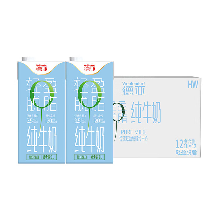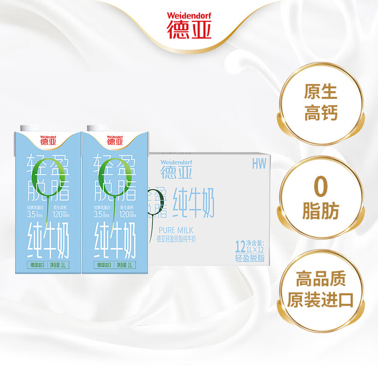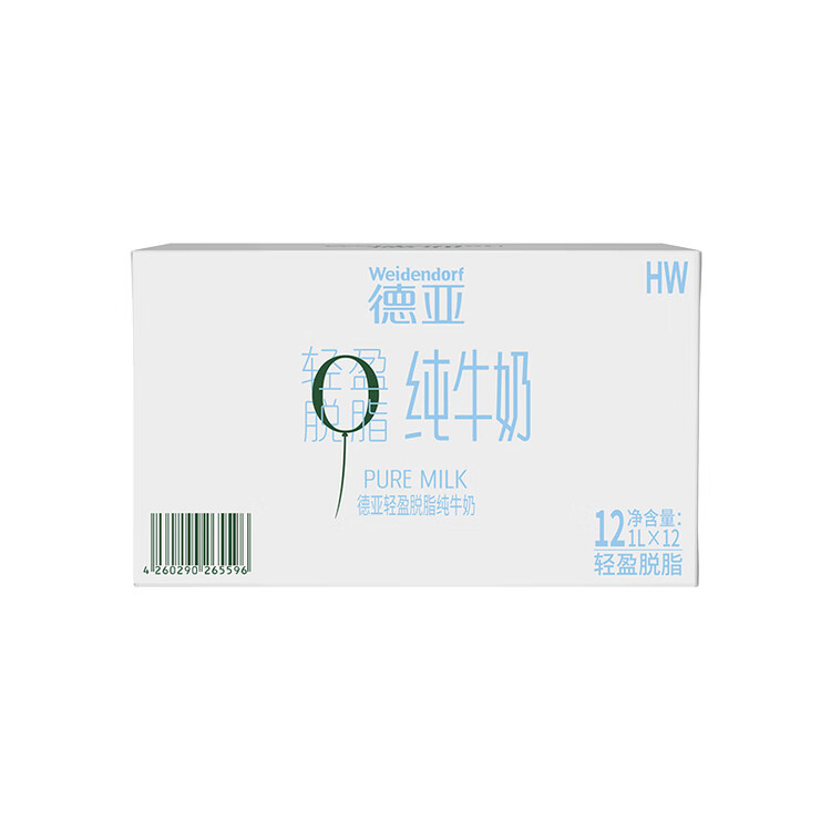 德亚(Weidendorf)德国进口欧洲牧场轻盈脱脂高钙纯牛奶1L*12盒0脂肪学生早餐